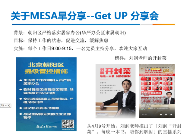 自2022年5月以來,北京市新冠病毒防控進入膠著狀態。根據北京市疫情防控相關要求,位于朝陽的華嚴北里辦公區嚴格執行有關規定,實行全員居家辦公。為促進全體黨員和群眾、老師和學生在居家辦公期間保持良好的溝通和交流,有效緩解大家的精神壓力,維持團隊良好的精神狀態,二室一支部決定充分發揮黨員先鋒模范作用,采取每日召開晨間“GET UP”分享會的形式,活躍團隊氛圍,激發思想碰撞,齊心協力做好防疫和居家辦公“雙統籌”,贏得疫情防控和業務發展的“雙勝利”。