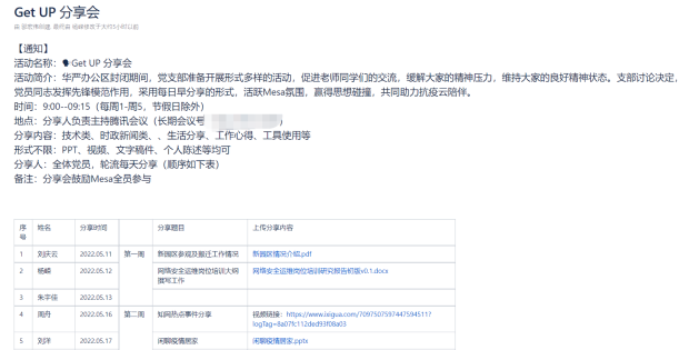自5月11日起,每日“GET UP”分享活動均有支部的黨員和積極分子圍繞黨建學習、技術交流、工作心得、防疫信息以及時政新聞等信息進行分享。此次活動旨在加強團隊成員在居家辦公期間溝通和交流,充分發揮基層黨組織的戰斗堡壘作用,不斷增強黨組織凝聚力和戰斗力,切實把黨員先鋒模范作用體現在各項任務中。